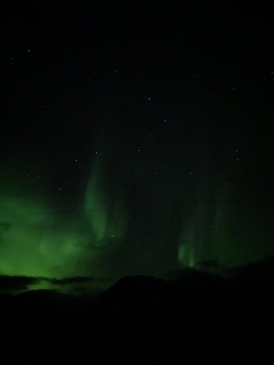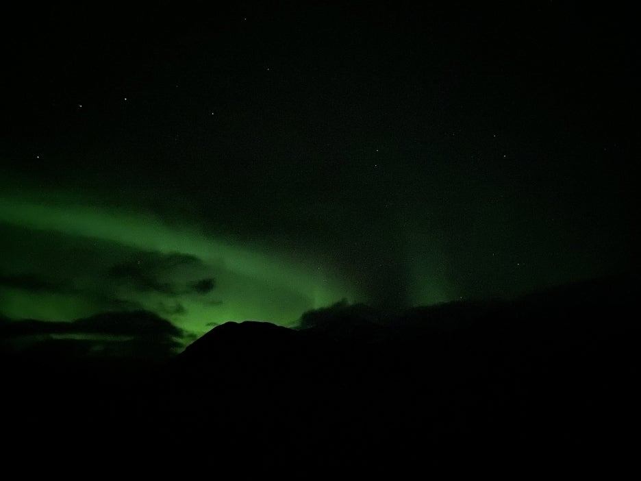 육안으로는 오로라가 잘 보이지 않았지만, 카메라로 촬영하니 오로라가 선명하게 보이기 시작했습니다!