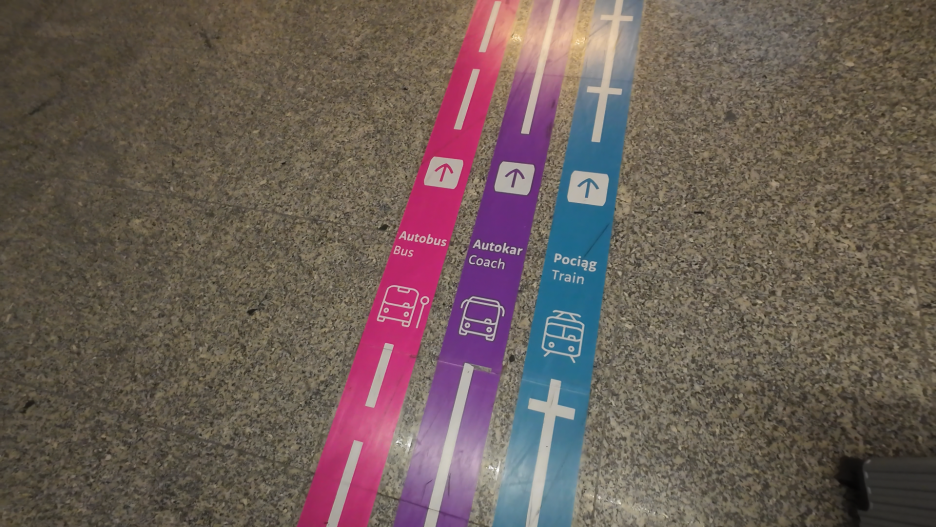 바닥에 있는 분홍색(autobus)를 따라서 걸어가면 됩니다