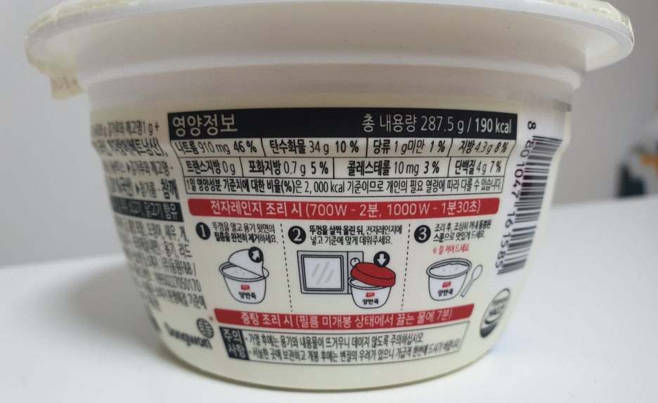 영양정보와 전자레인지 조리 방법이 적혀 있습니다