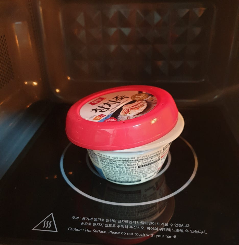 전자레인지에 뚜껑을 살짝 덮고 2분(700W 기준) 정도 돌립니다