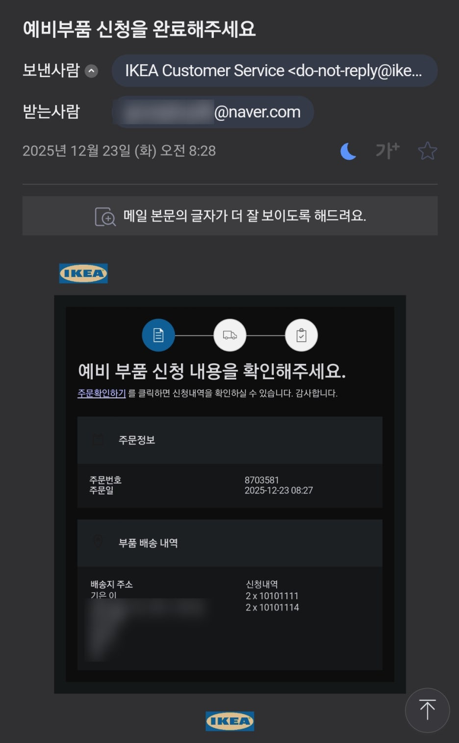 메일을 확인해보면, 예비 부품 신청을 완료해달라는 메일이 와있는데, 무엇을 완료하라는 건지는 잘 모르겠어요