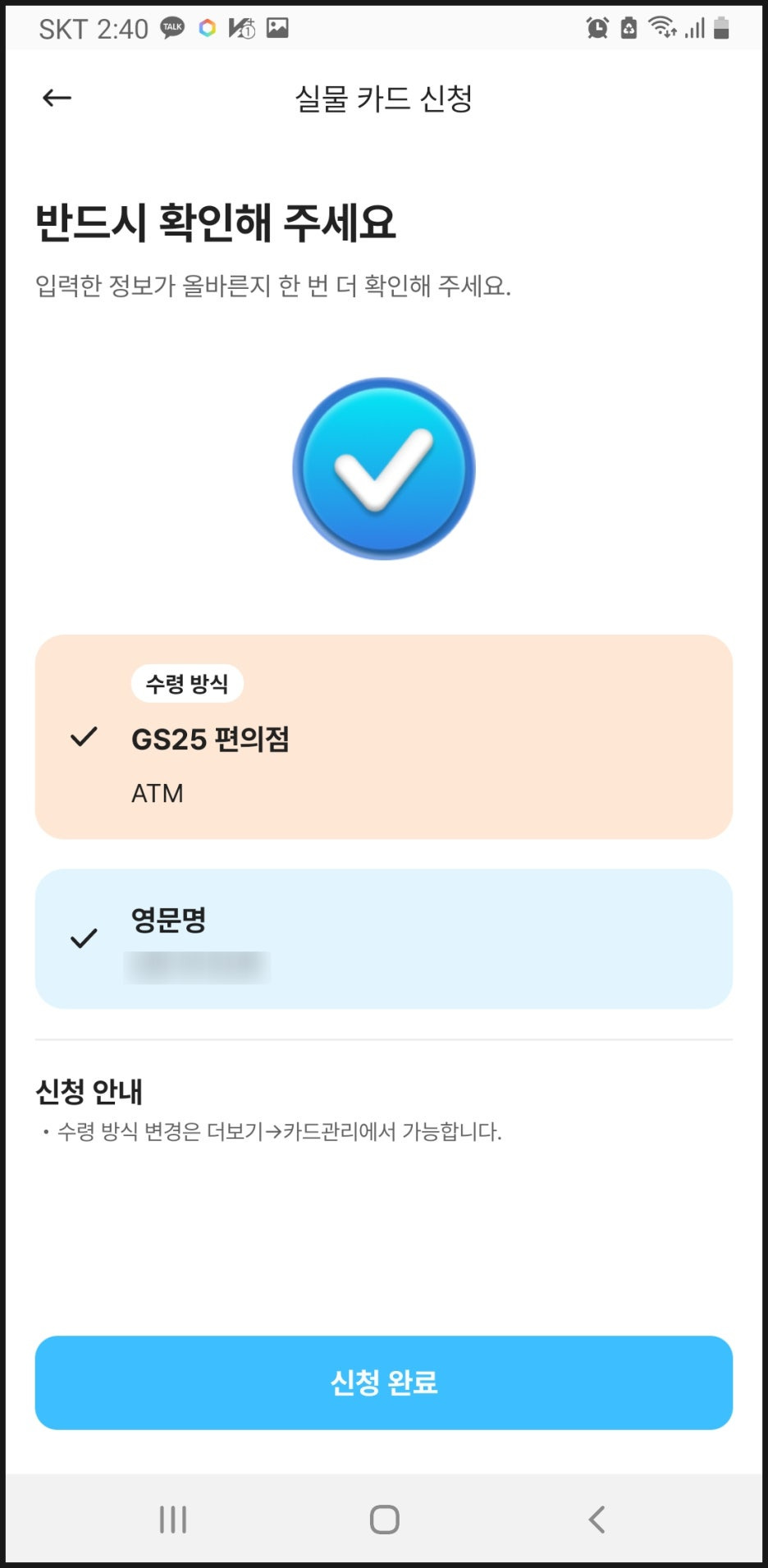 수령 방식과 영문명 확인 후 '신청 완료' 버튼 터치