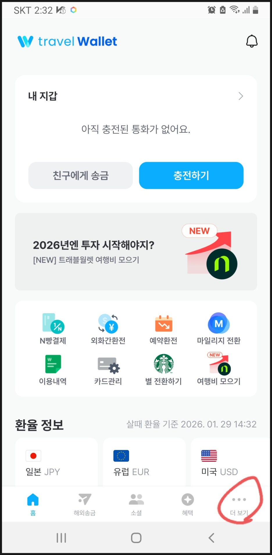 트래블월렛 어플 메인화면에서 오른쪽 하단에 있는 더보기 터치