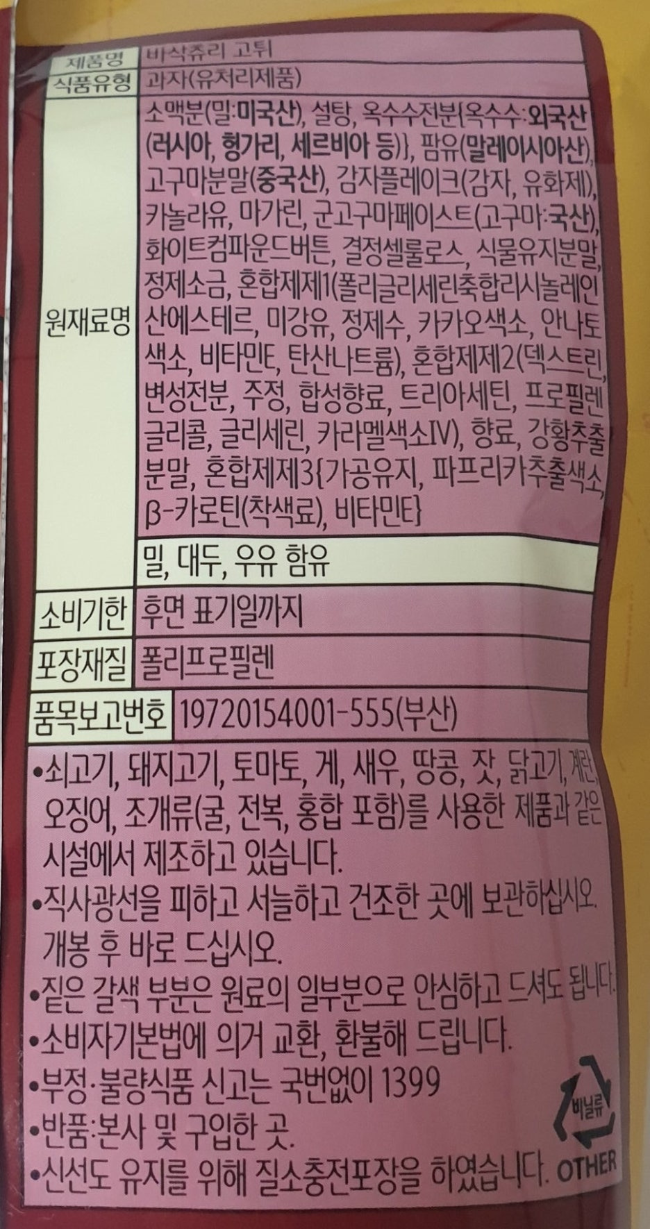 원재료 정보를 포함한 제품 정보가 적혀 있습니다