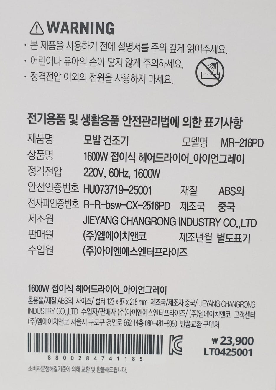 유의사항과 함께 제품에 대한 상세 정보가 적혀 있습니다