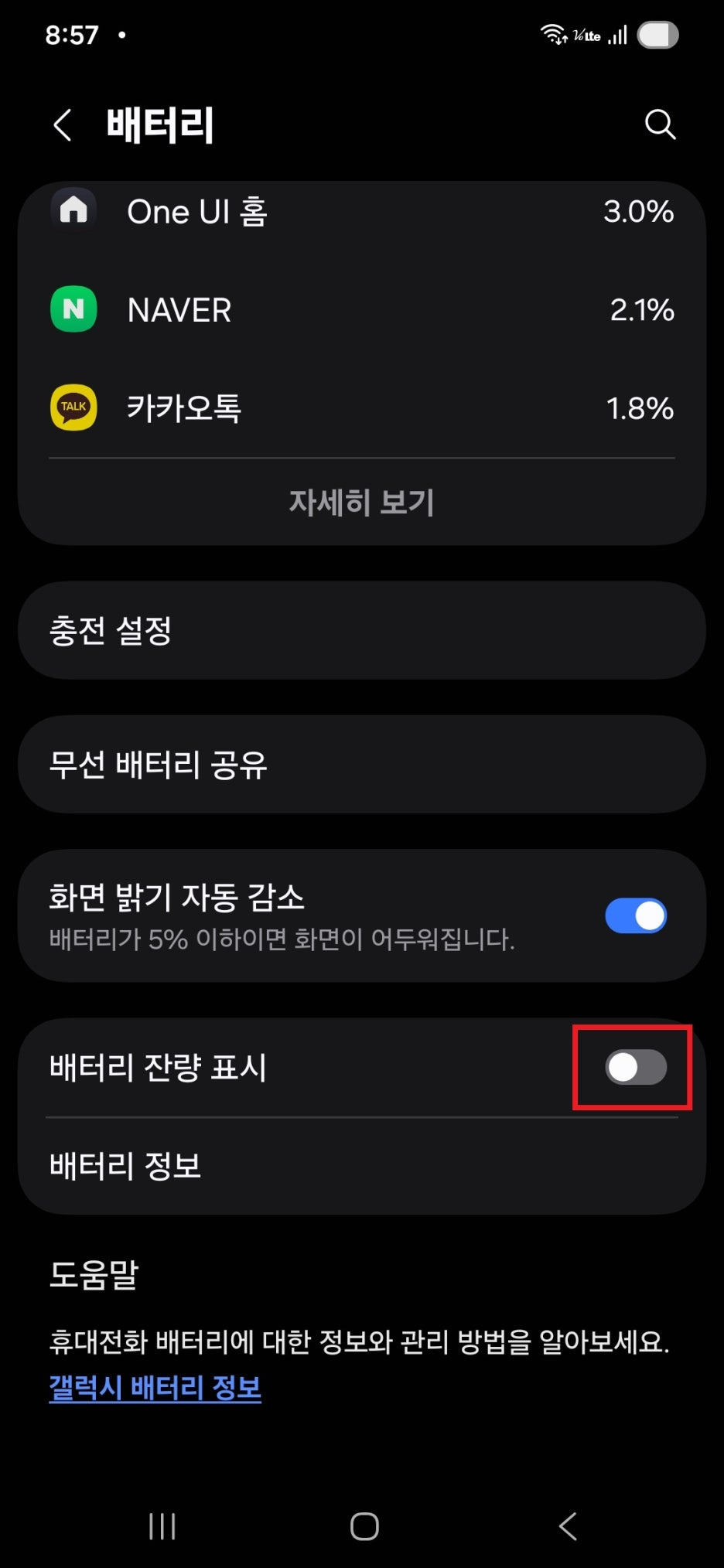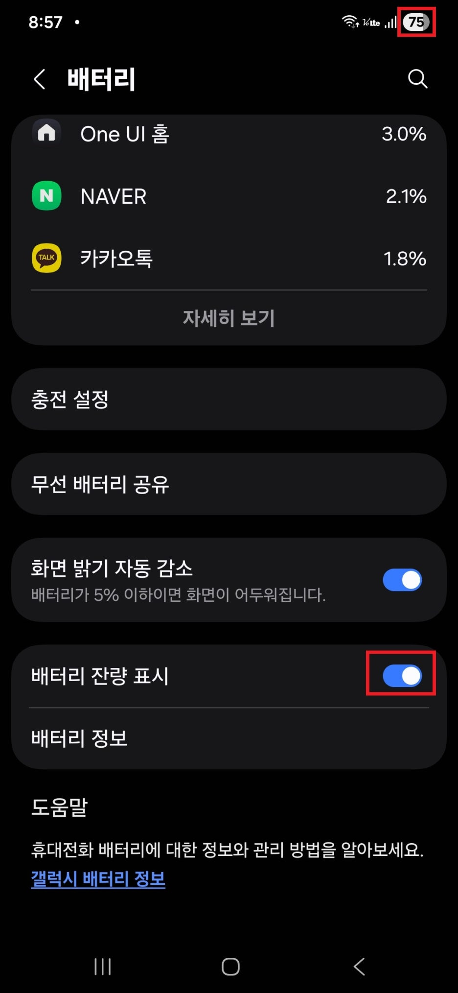 화면을 아래로 쭉 내린 뒤, 배터리 잔량 표시를 활성화하기