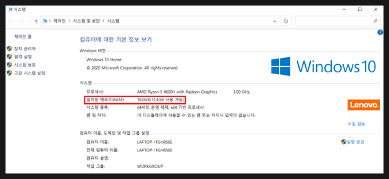 장착 후 램이 16GB로 확장된 것을 확인할 수 있습니다.