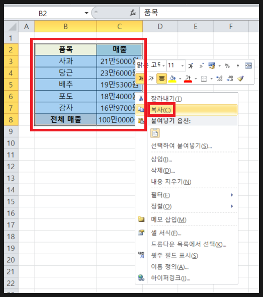 해당 셀을 복사한 뒤 그림 형태로 붙여 넣어 보겠습니다.