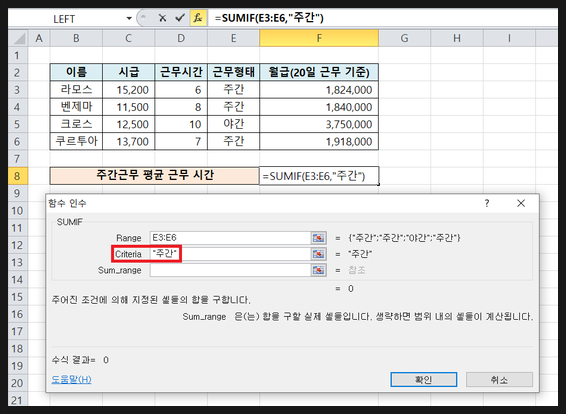 SUMIF 함수로 주간 근무자 전체 근무 시간을 구하고,