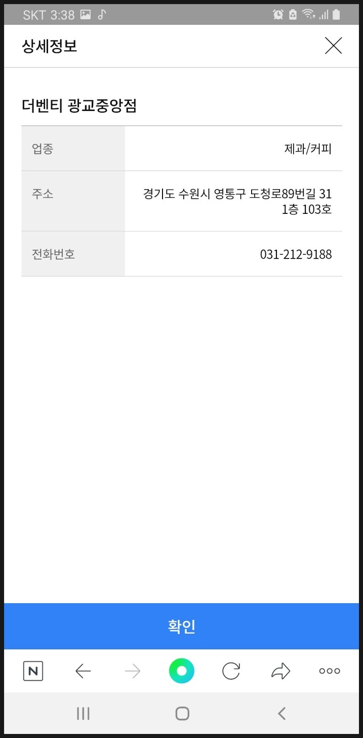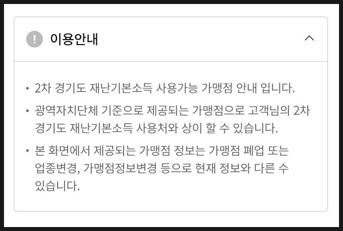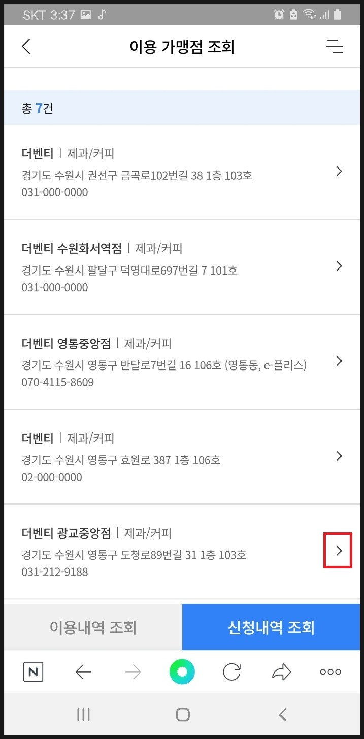 4. 검색 조건에 따른 가맹점 조회가 가능하며, > 모양을 터치하면 상세 정보 확인 가능