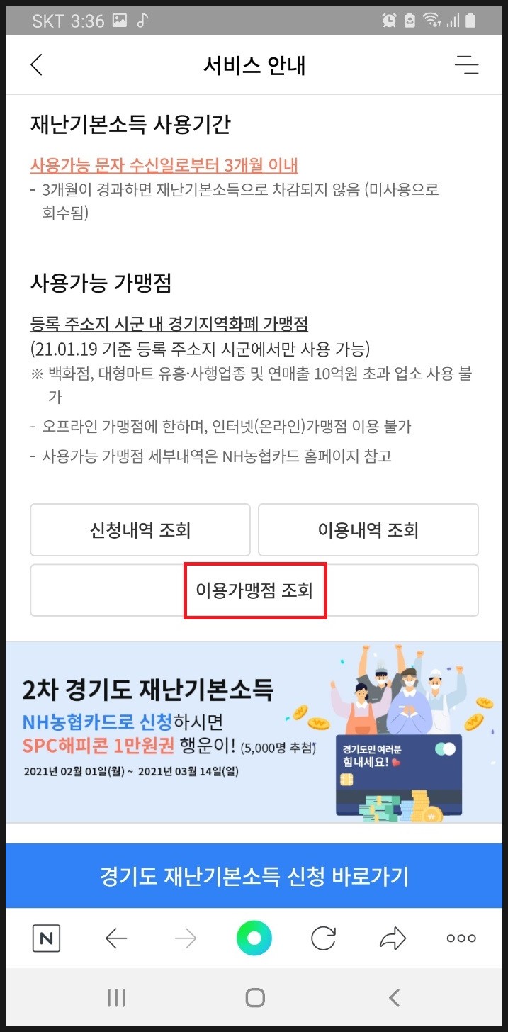 2. 화면을 아래로 내려서 [이용 가맹점 조회] 터치