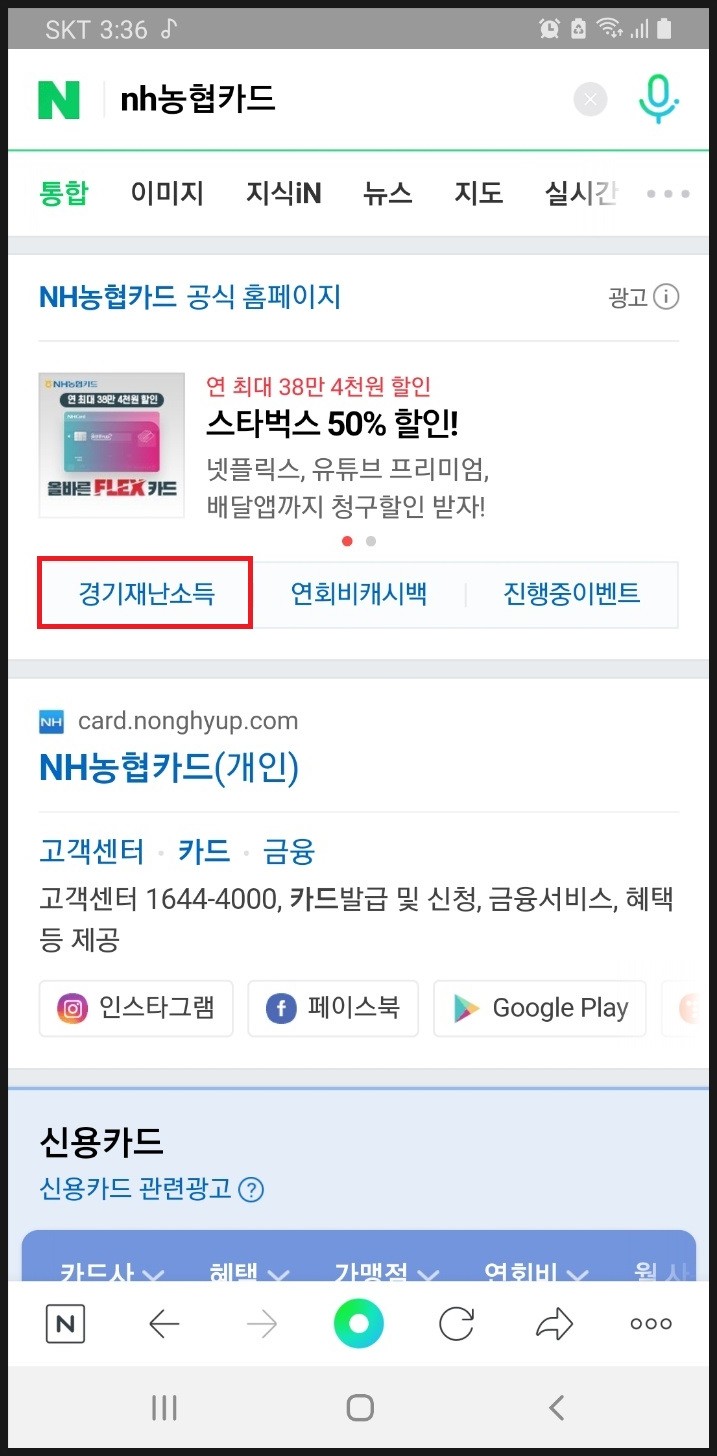 1. 네이버에서 NH농협카드를 검색한 뒤 [경기재난소득] 터치
