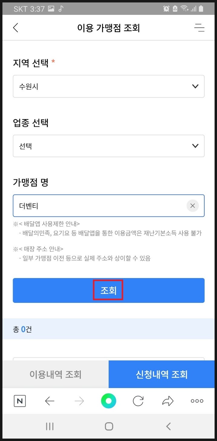 3. 지역, 업종(선택하지 않아도 조회 가능) 선택 후 가맹점 명을 입력하고 [조회] 터치