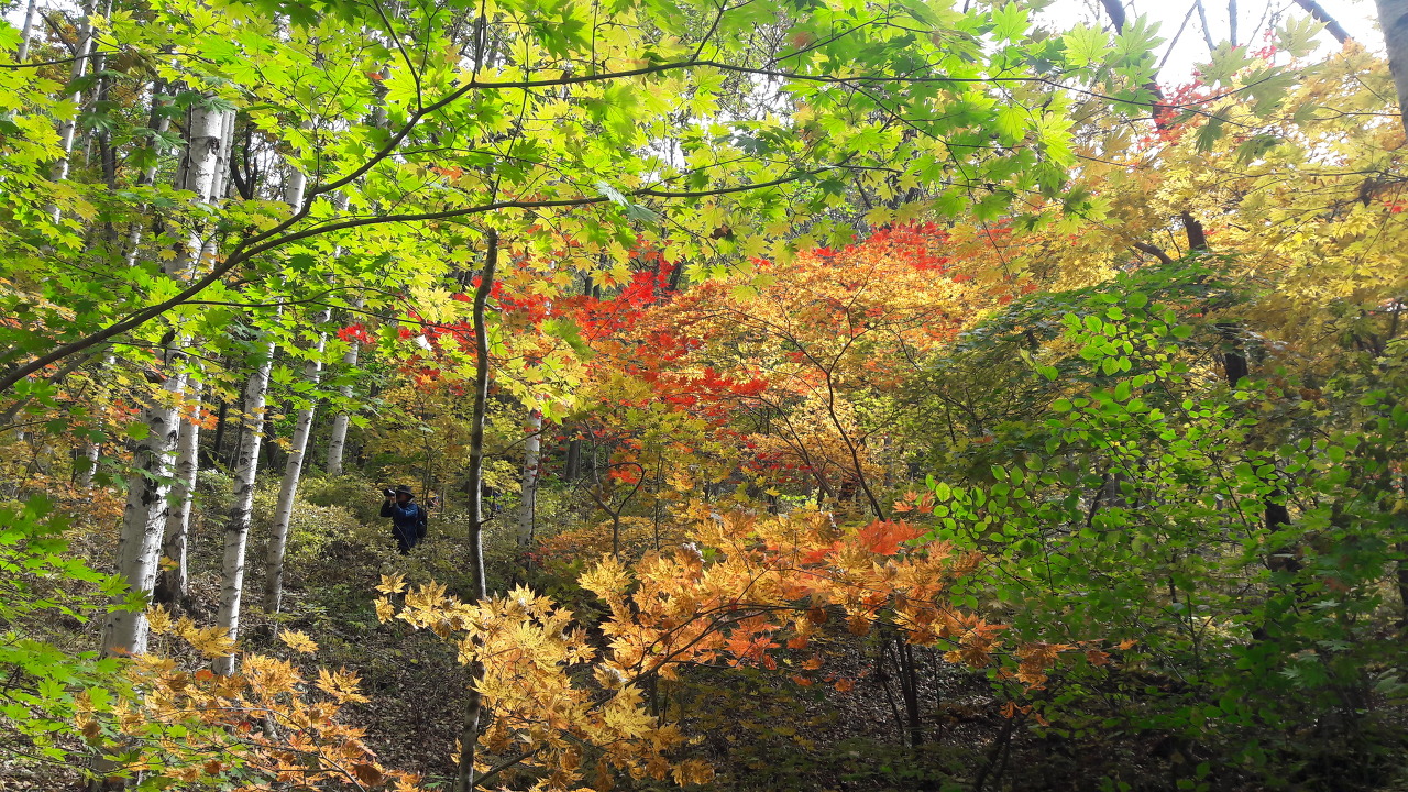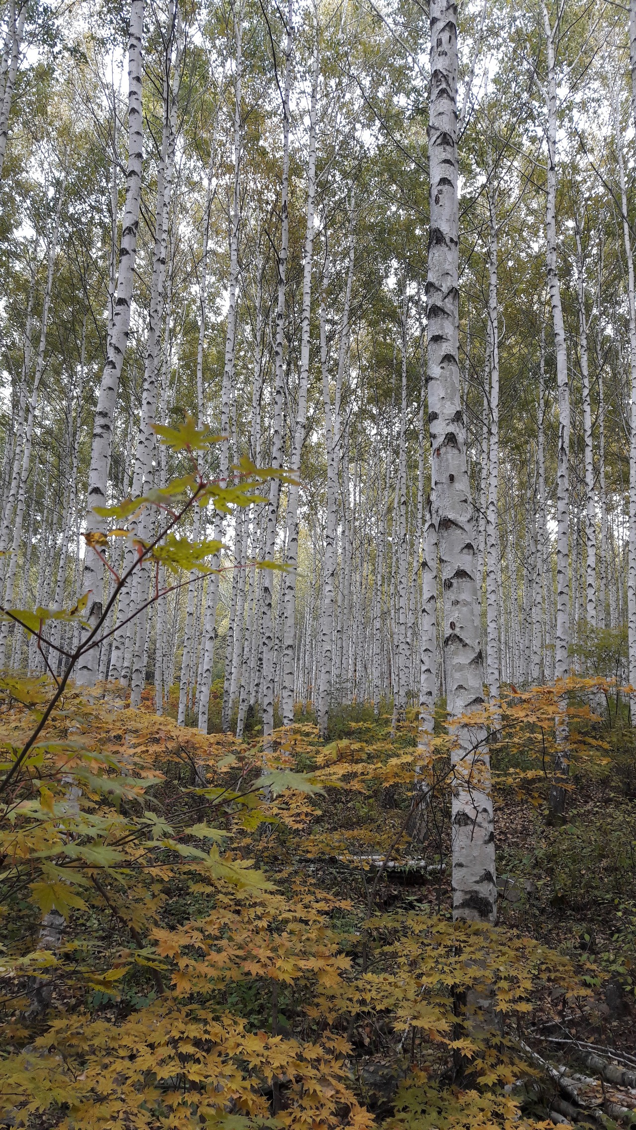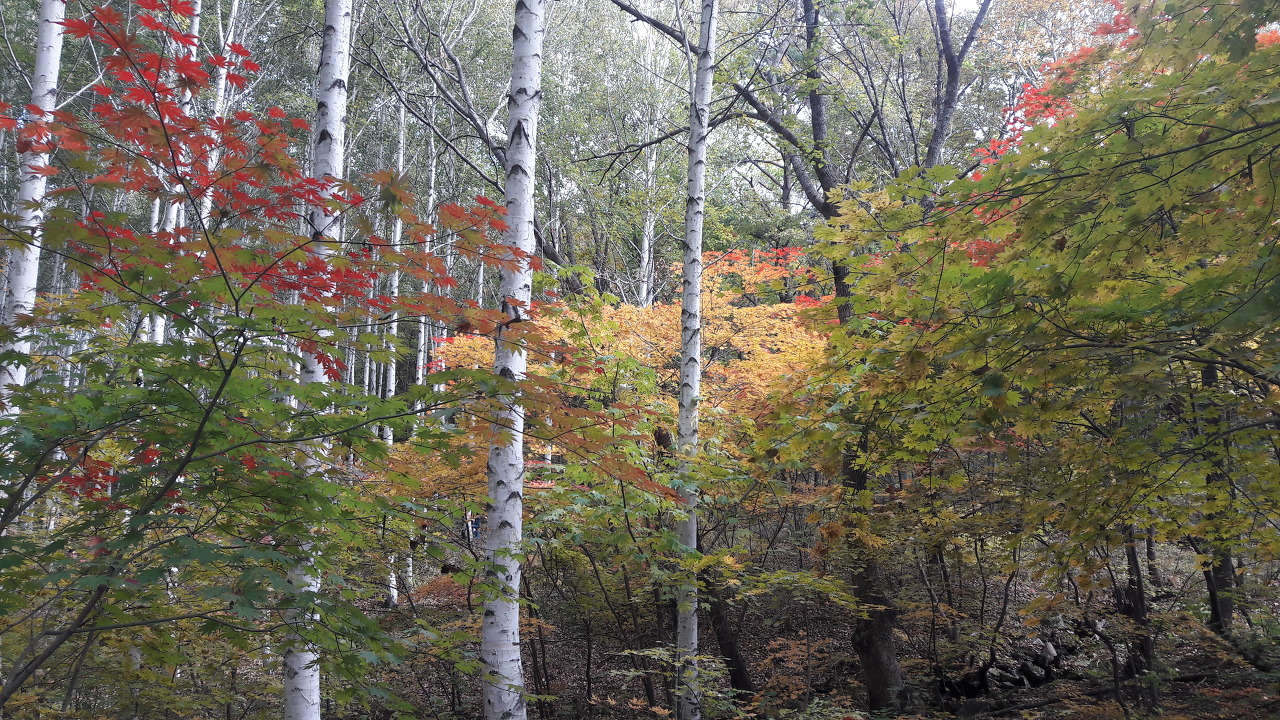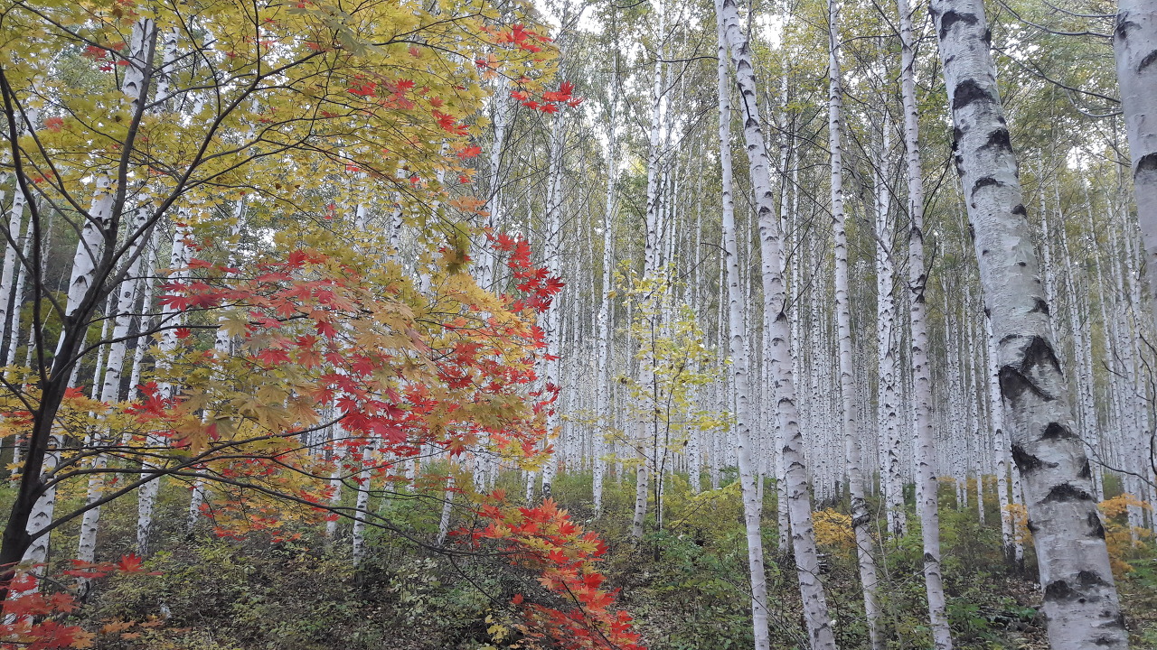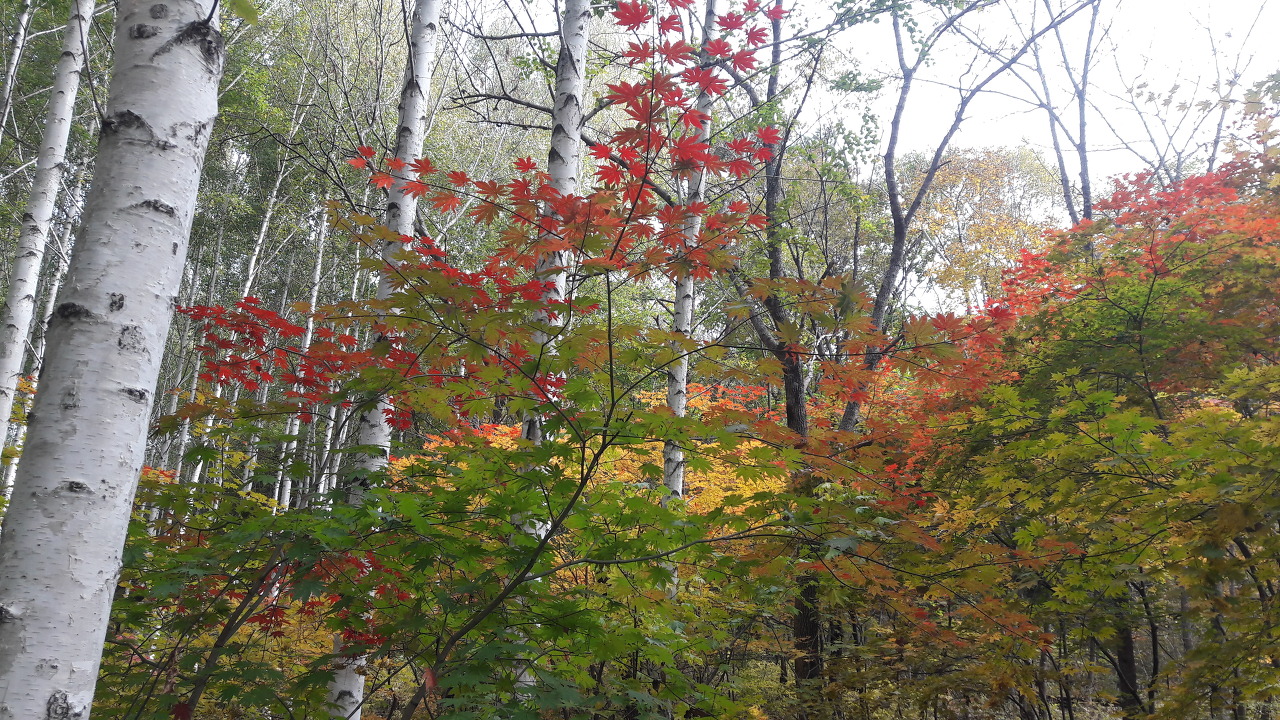 단풍과 자작나무가 조화롭게 어울려 있습니다.