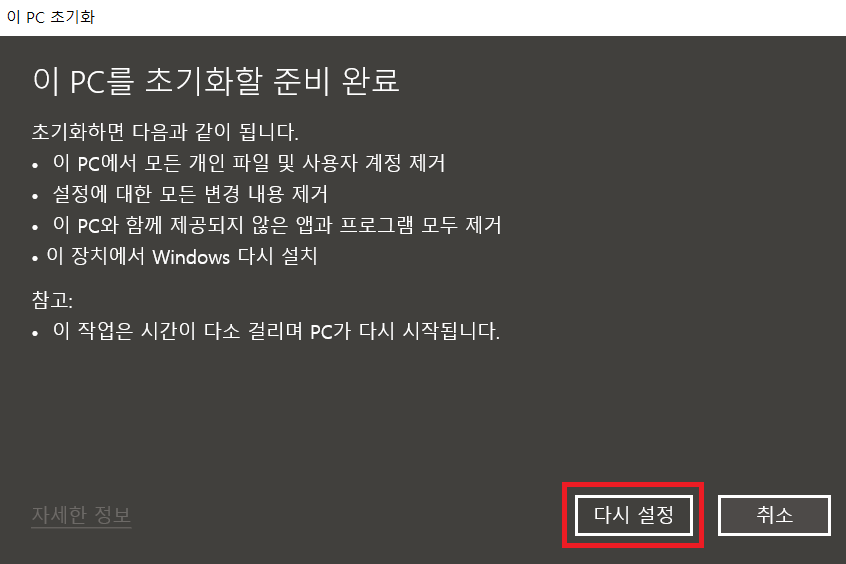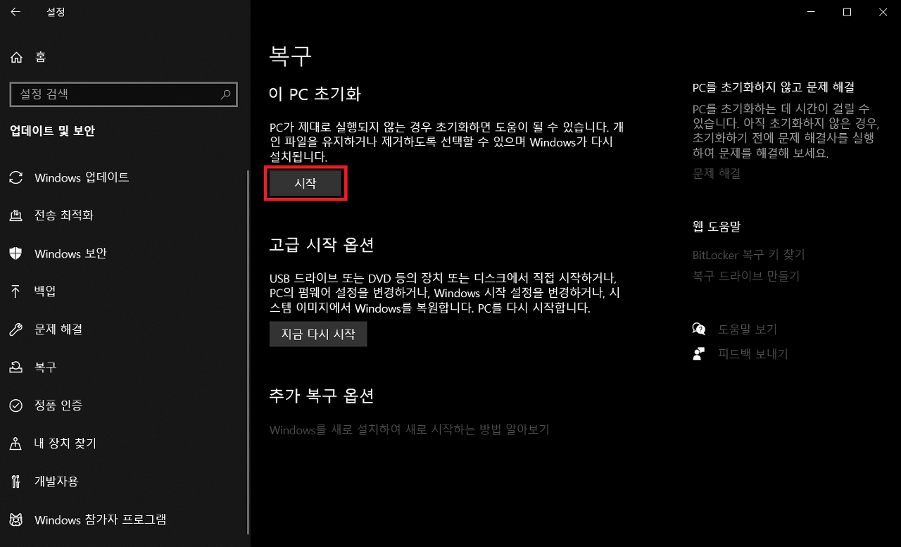이번에는 별도의 윈도우 설치 USB 없이 윈도우 10을 포맷(초기화) 하는 방법을 알아보겠습니다.