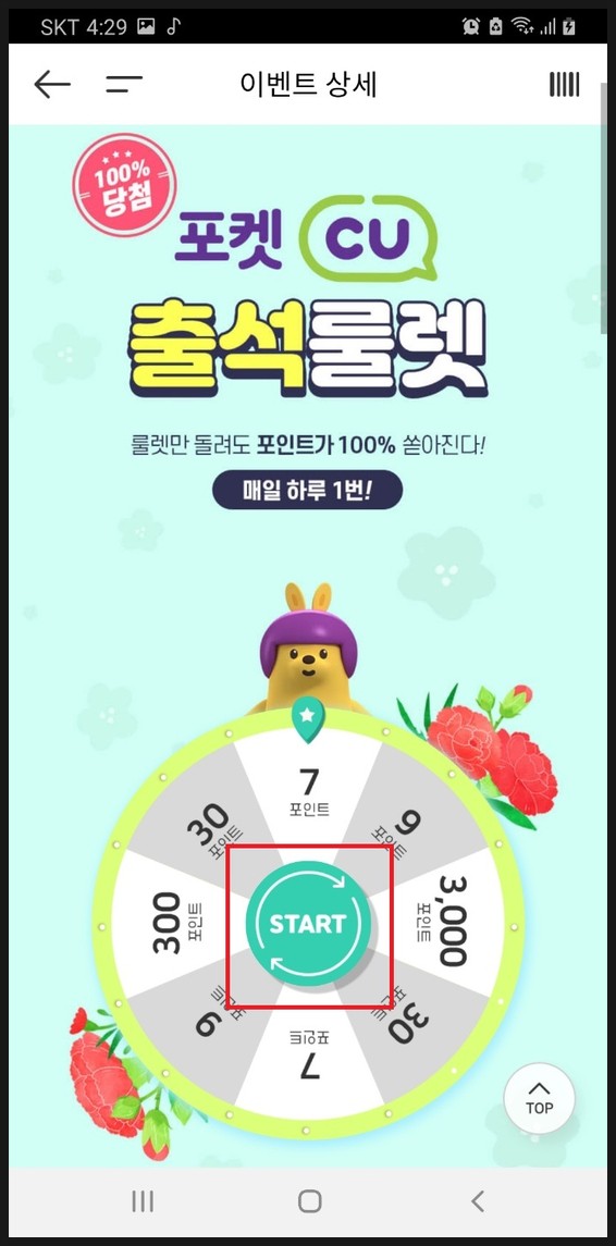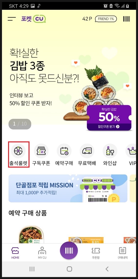 포켓CU 메인 화면에서 출석룰렛을 터치 합니다.
