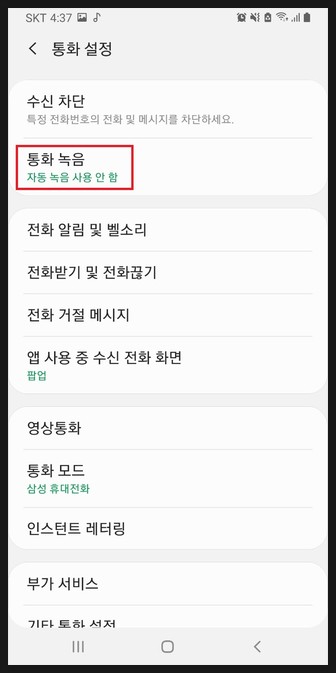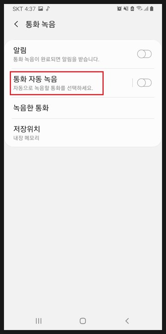5. 통화 자동 녹을을 터치 합니다.