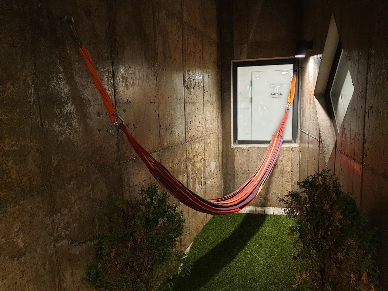1층에 해먹도 있는데, 위쪽이 뻥 뚫려 있어서 하늘을 볼 수 있습니다.