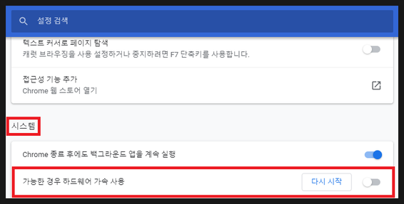 3. 시스템 항목에서 [가능한 경우 하드웨어 가속 사용] 체크 해제 후 다시 시작