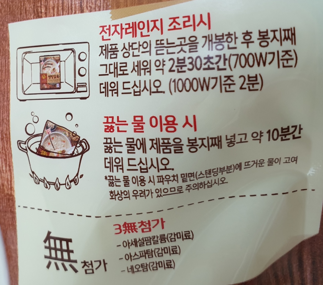 제품 상단의 뜯는 곳을 개봉한 후 봉지째 그대로 세워 약 2분 30초간(700w기준) 데워 드십시오.(1000w기준 2분)