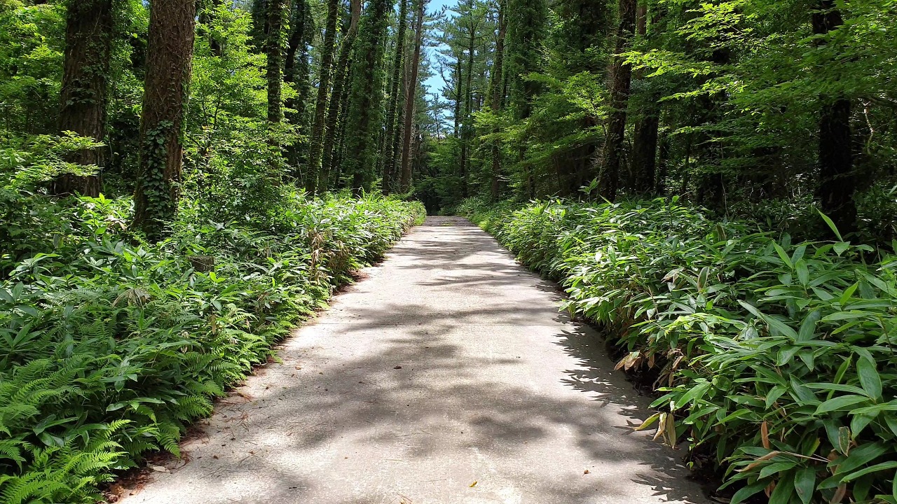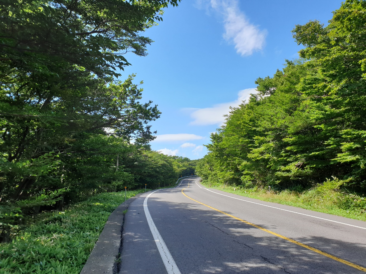 울창한 나무 숲을 관통해서 지나가고 있습니다.