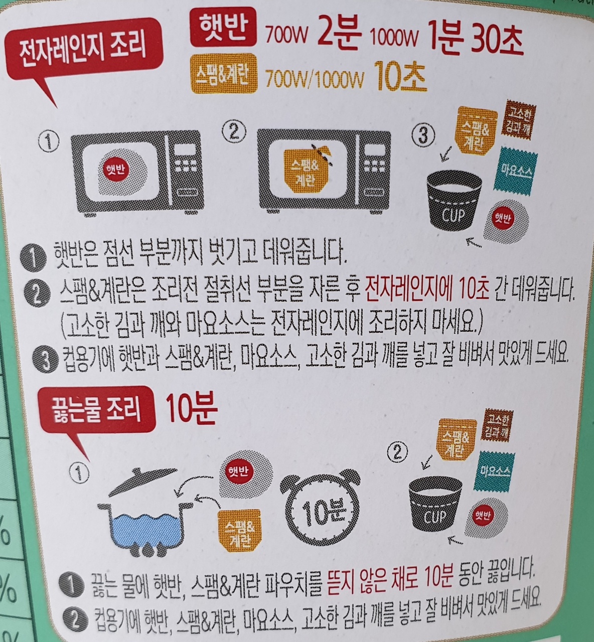 - 햇반: 700w(2분) / 1000w(1분 30초)