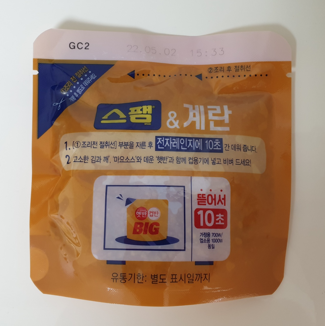 2. 스팸&계란은 조리 전 절취선 부분을 자른 후 전자레인지에 10초 데워줍니다.
