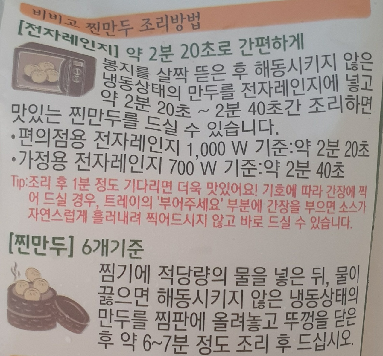 봉지를 살짝 뜯은 후 해동시키지 않은 냉동 상태의 만두를 전자레인지에 넣고 약 2분 20초 ~ 2분 40초간 조리하면 맛잇는 찐만두를 드실 수 있습니다.
