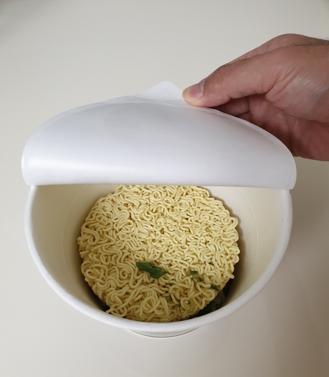 뚜껑을 표시선까지 열고, 분말스프와 김치스프를 넣고 끓는물을 용기 안쪽선까지 부은 다음 뚜껑을 닫고, 약 4분 후 드시면 됩니다.