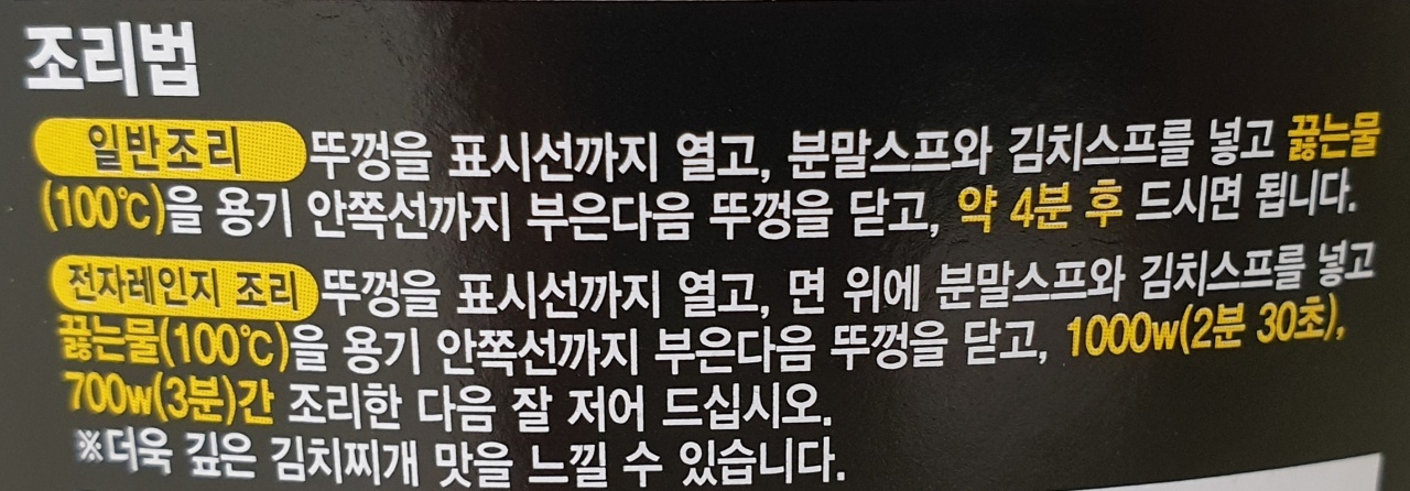 뚜껑을 표시선까지 열고, 면 위에 분말스프와 김치스프를 넣고 끓는물을 용기 안쪽선까지 부은 다음 뚜껑을 닫고, 1000w(2분 30초), 700w(3분)간 조리한 다음 잘 저어 드십시오.
