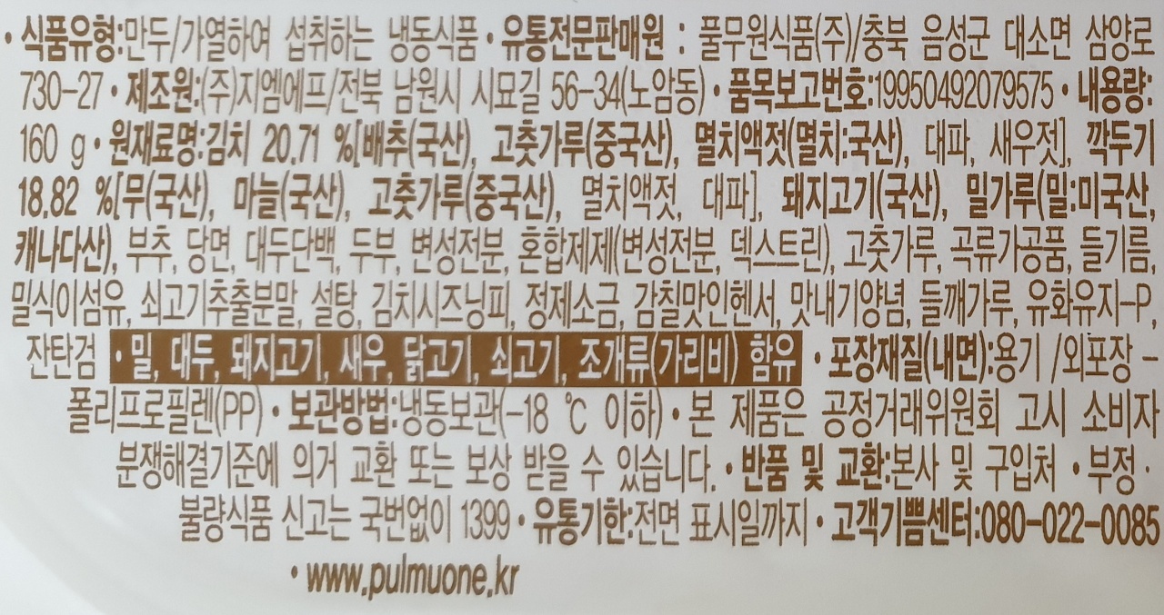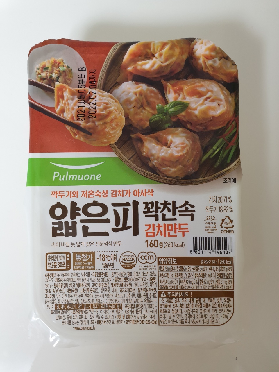 풀무원 얇은피 꽉찬속 김치만두 입니다.