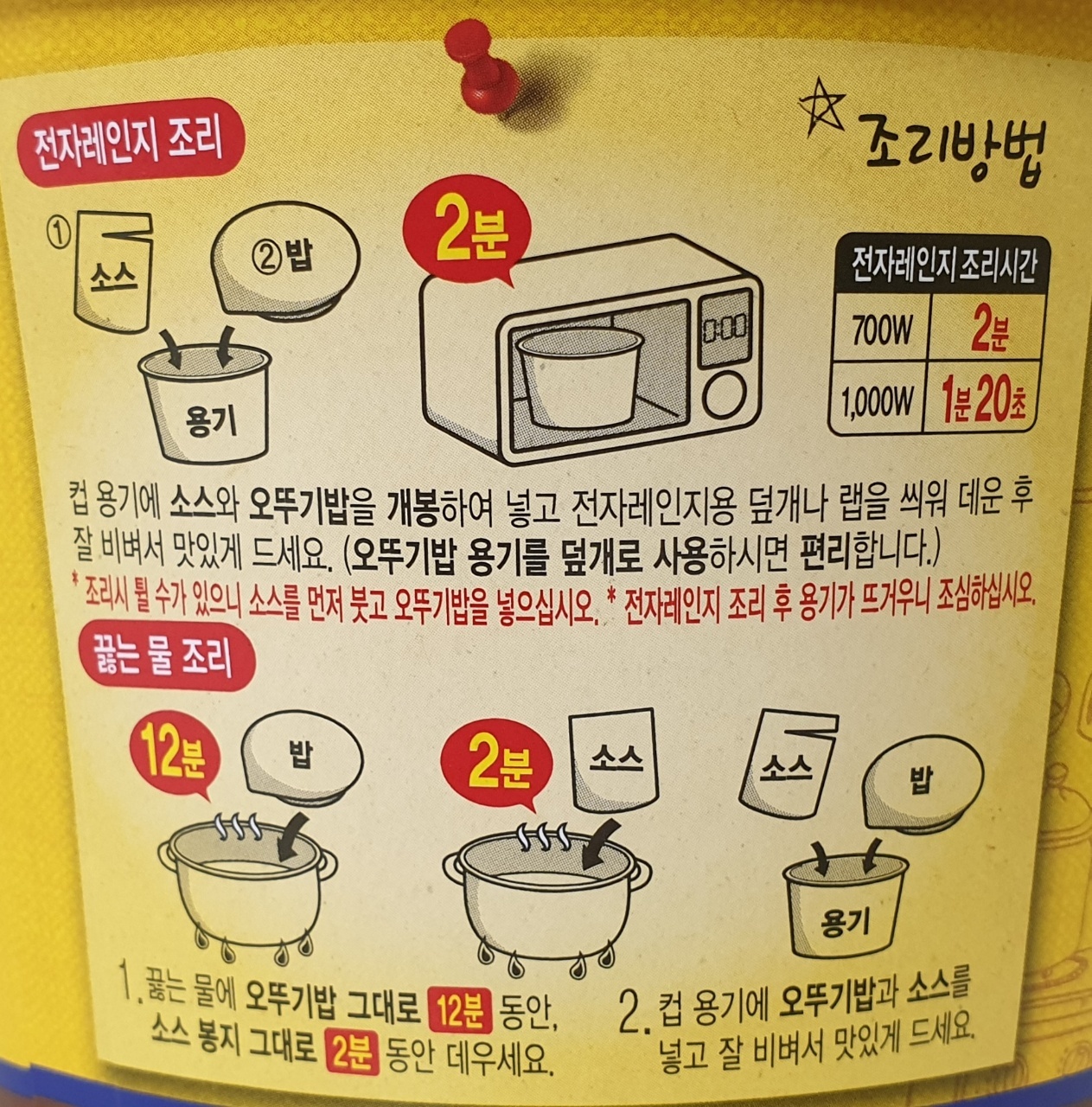 컵 용기에 소스와 오뚜기밥을 개봉하여 전자레인지용 덮개나 랩을 씌워 데운 후 잘 비벼서 드세요.