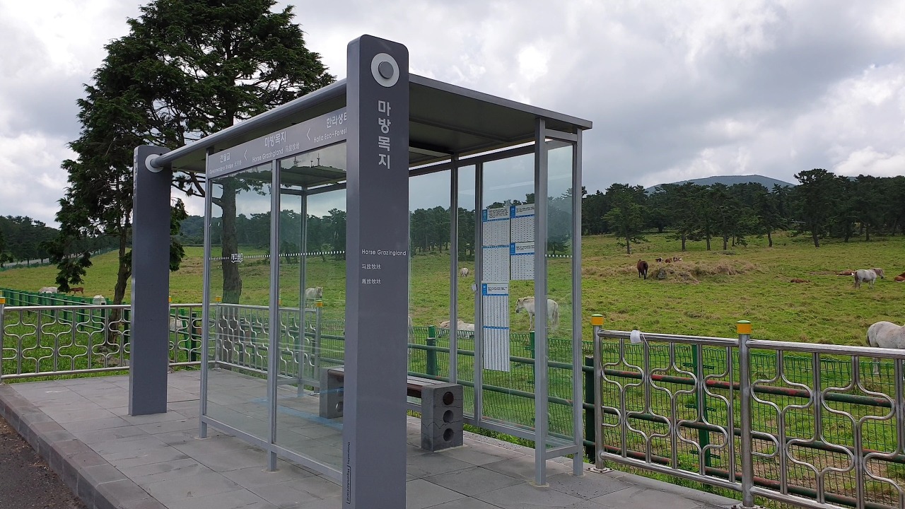 버스 정류장 뒤에 말들이...ㄷㄷ