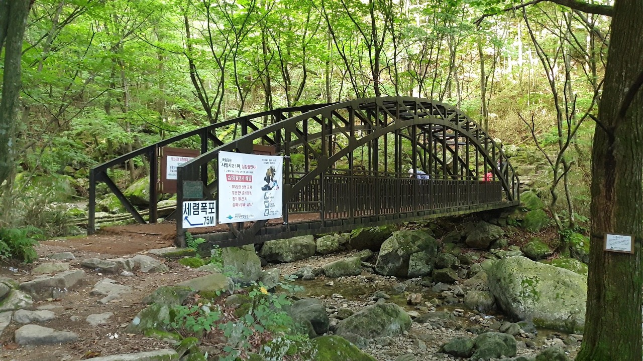 세렴폭포를 기준으로 계곡길과 사다리병창 코스 중 선택해서 올라갈 수 있습니다.