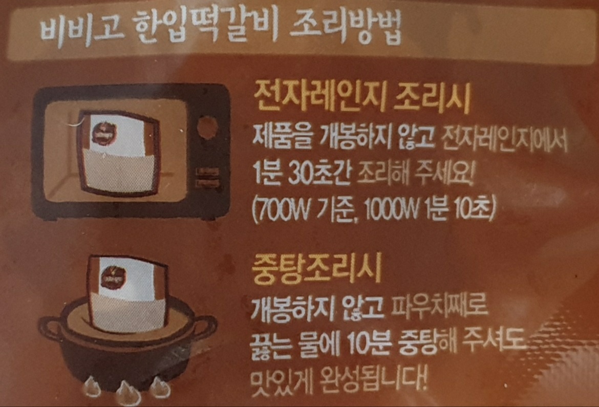 - 전자레인지 조리 시: 제품을 개봉하지 않고 전자레인지에서 700W(1분 30초), 1000W(1분 10초)간 조리해주세요.