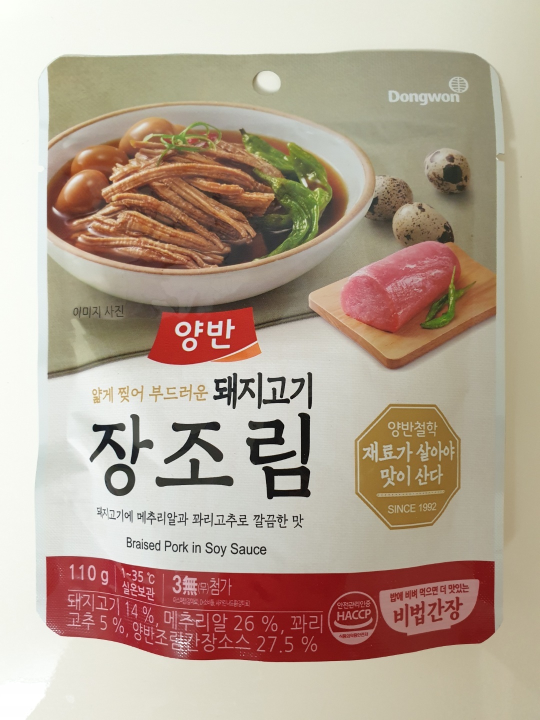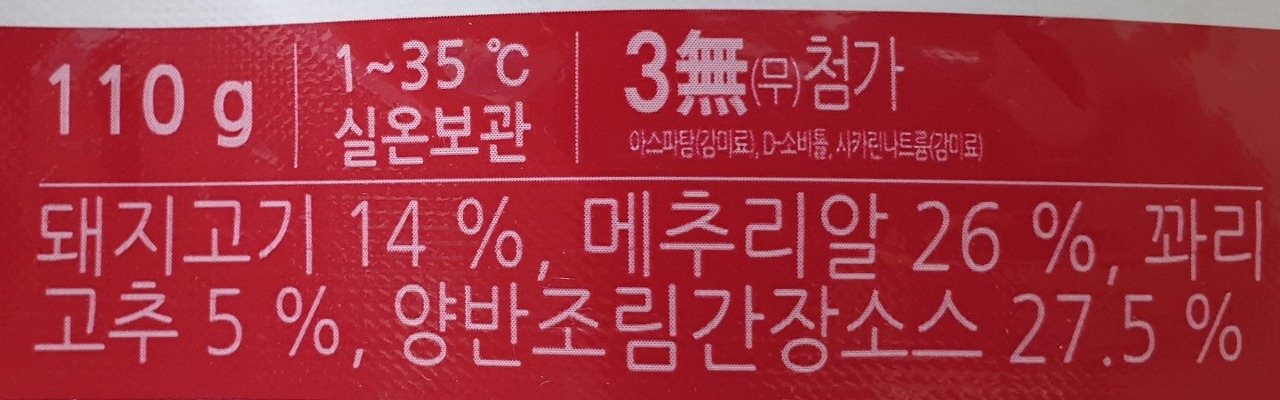 돼지고기 14%, 메추리알 26%, 꽈리고추 5%, 양반조림간장소스 27.5%