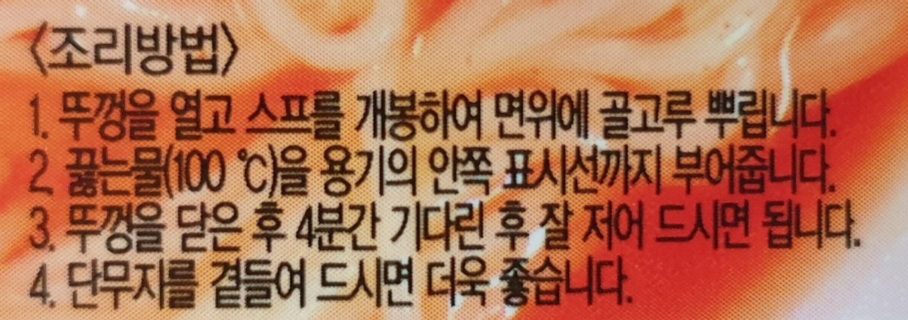 1. 뚜껑을 열고 스프를 개봉하여 면 위에 골고루 뿌립니다.
