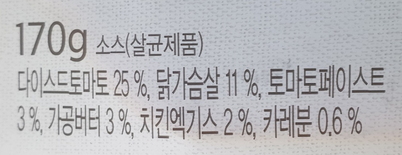 다이스드토마토 25%, 닭가슴살 11%, 토마토페이스트 3%, 가공버터 3%, 치킨엑기스 2%, 카레분 0.6%
