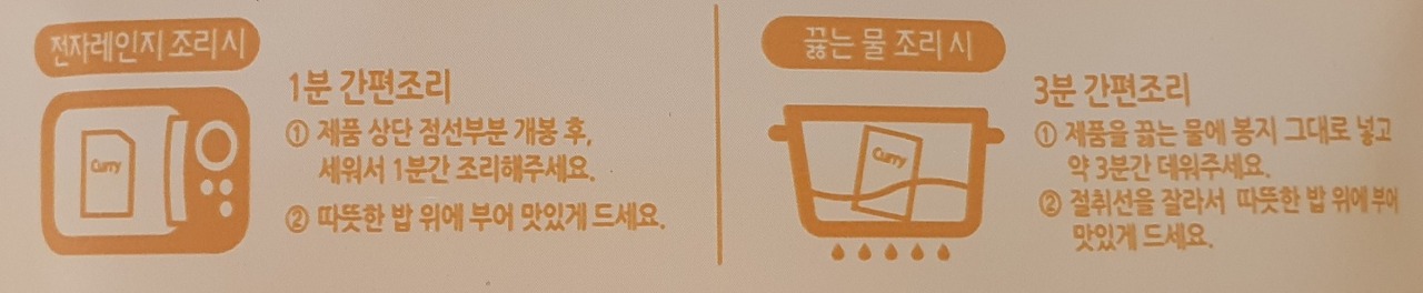 1. 제품 상단 점선 부분 개봉 후, 세워서 1분간 조리해주세요.