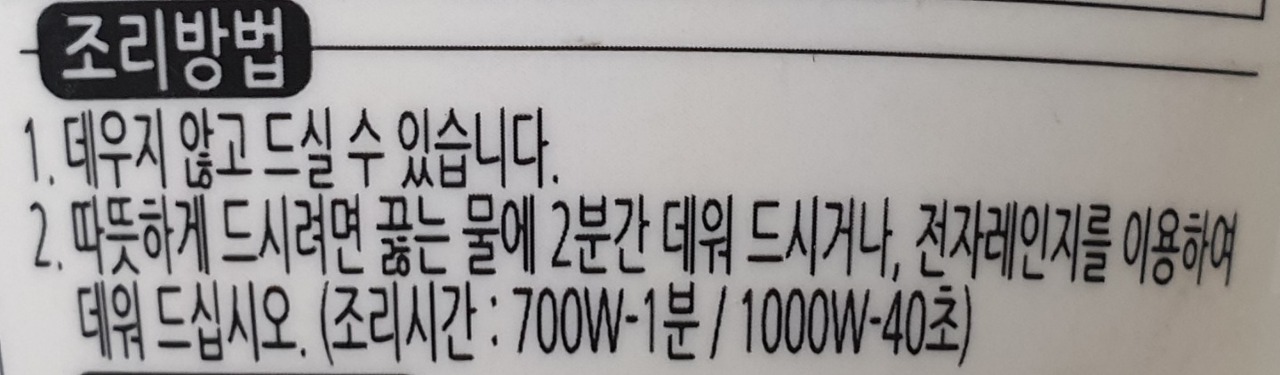 2. 따뜻하게 드시려면 끓는 물에 2분간 데워 드시거나, 전자레인지를 이용하여 데워 드십시오.