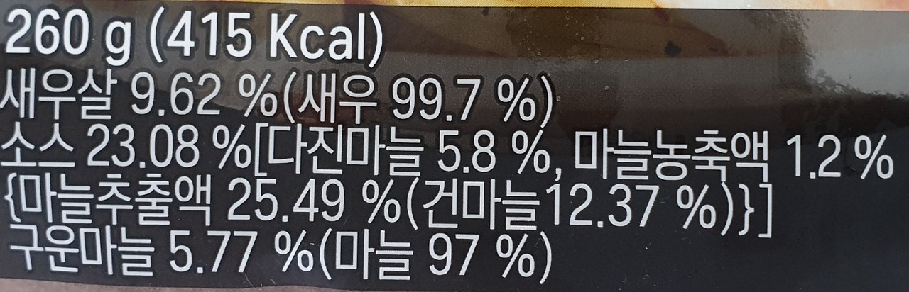 소스 23.08% [다진마늘 5.8%, 마늘농축액 1.2% {마늘추출액 25.49%(건마늘 12.37%)}]
