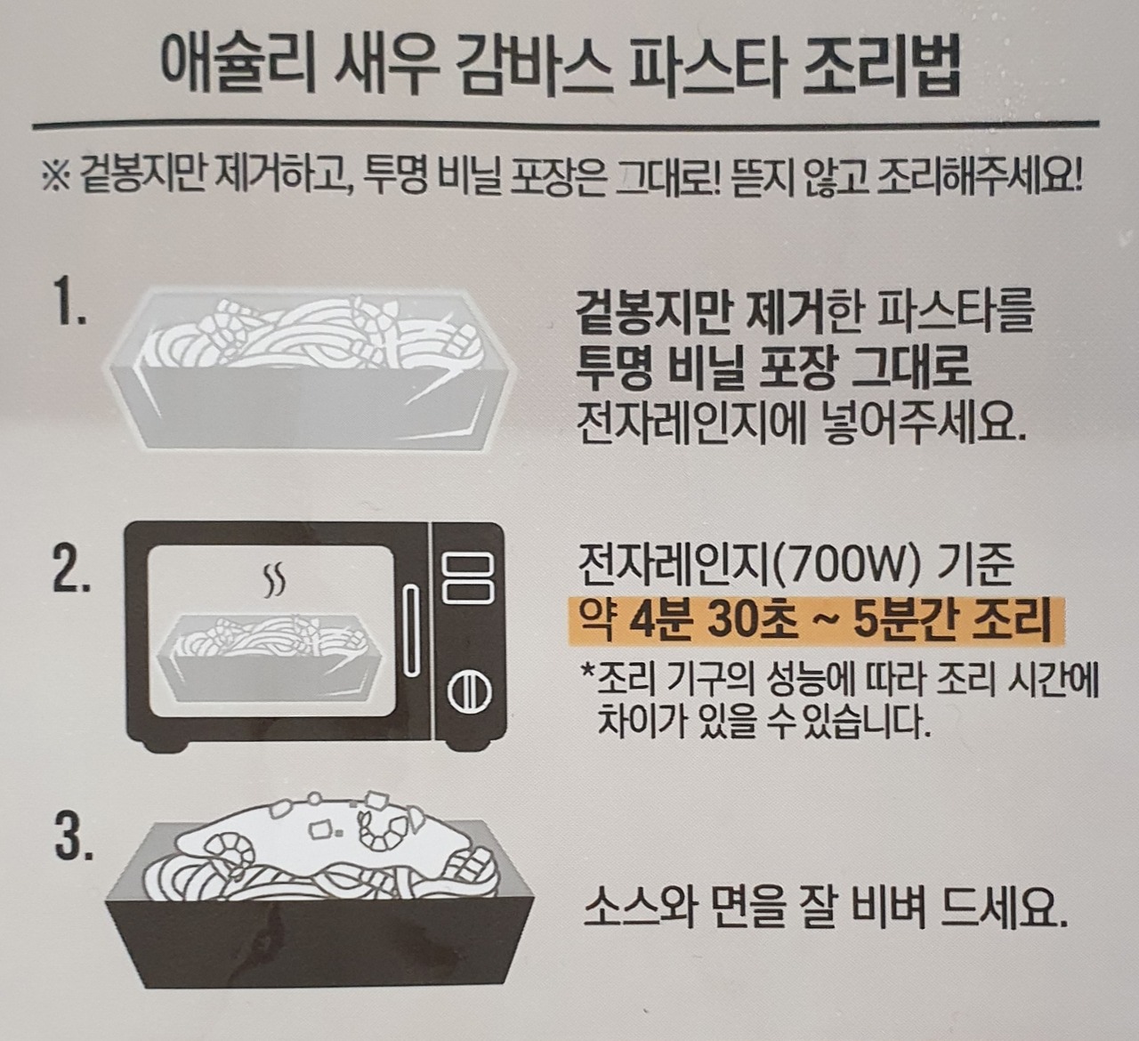 1. 겉봉지만 제거한 파스타를 투명 비닐 포장 그대로 전자레인지에 넣어주세요.