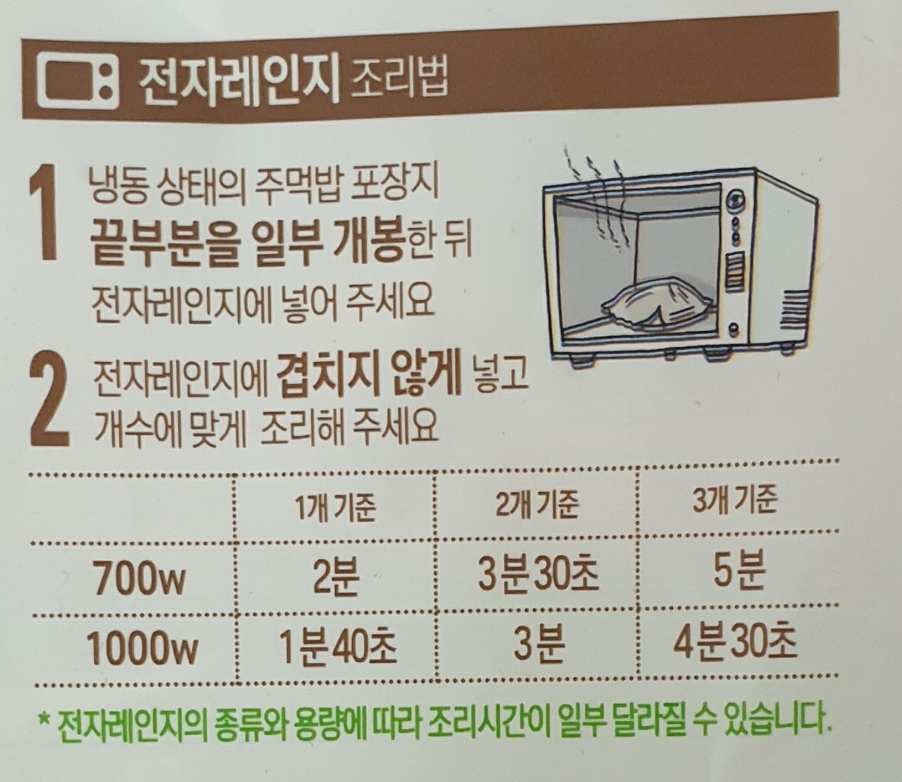 1. 냉동 상태의 주먹밥 포장지 끝부분을 일부 개봉한 뒤 전자레인지에 넣어주세요.