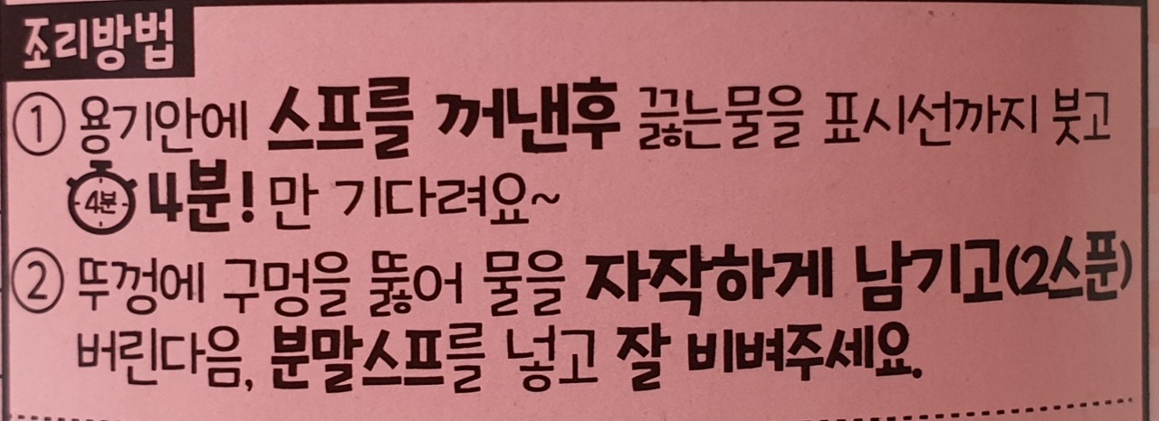 1. 용기 안에 스프를 꺼낸 후 끓는 물을 표시선까지 붓고 4분만 기다려요.