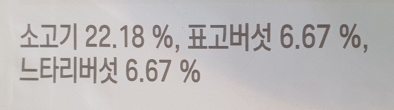 소고기 22.18%, 표고버섯 6.67%, 느타리버섯 6.67%