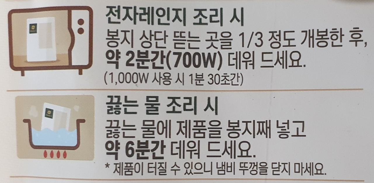 봉지 상단 뜯는 곳을 1/3 정도 개봉한 후, 약 2분간(700W) 데워 드세요.