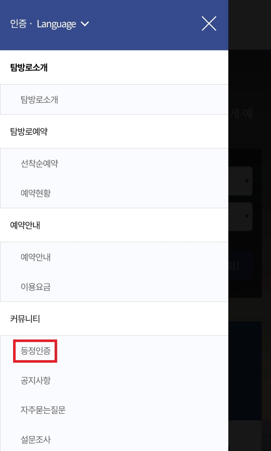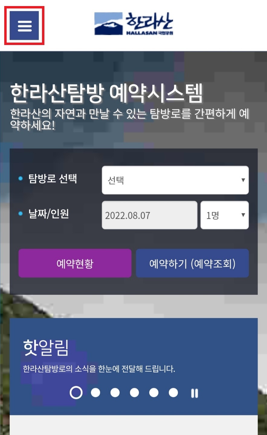 - 홈페이지 메인화면 왼쪽 상단에 있는 메뉴 버튼을 터치