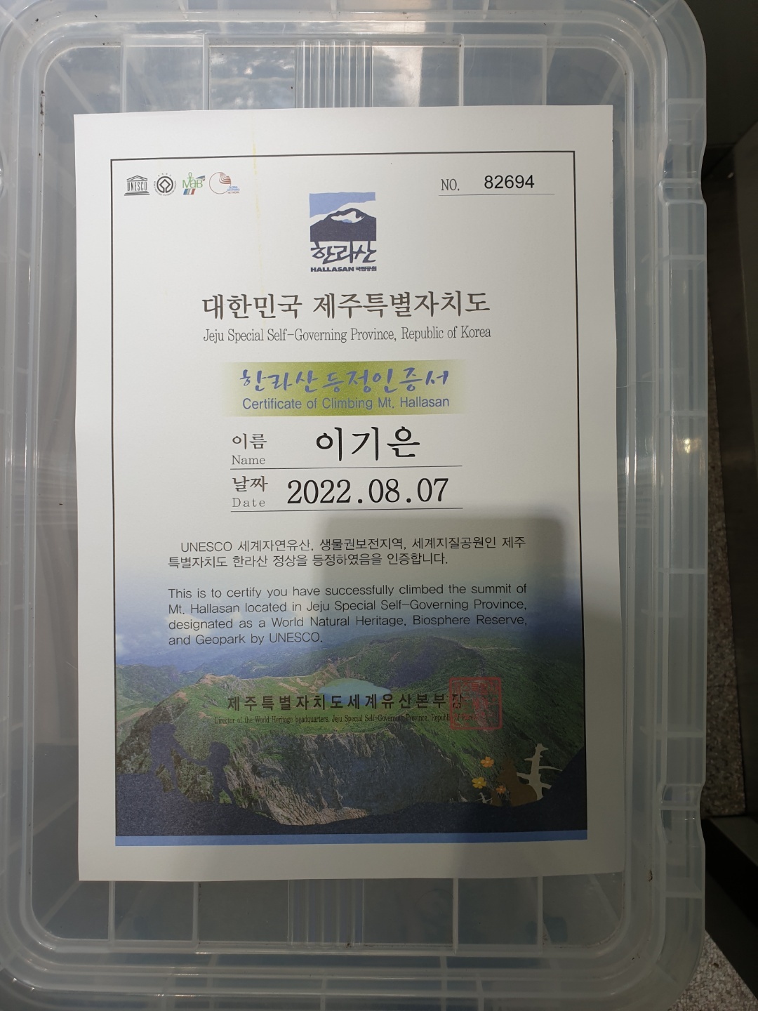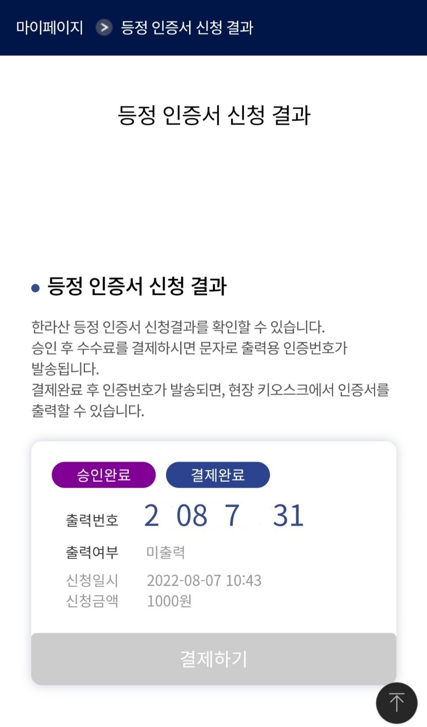- 한라산 등정 인증서 발급 완료!