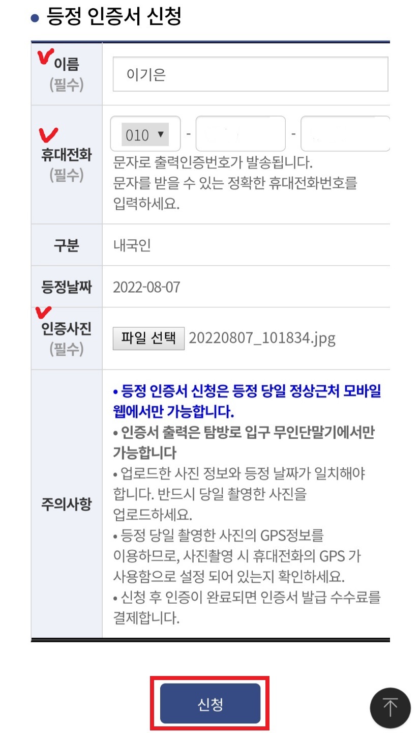 - 이름과 휴대전화번호를 입력한 뒤 [파일선택]을 터치해서 인증사진을 등록합니다.