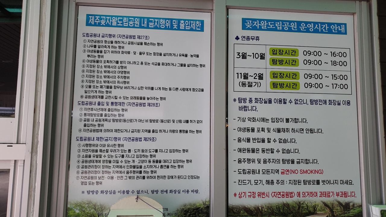 매표소에 공원에 대한 안내 사항이 적혀 있습니다.